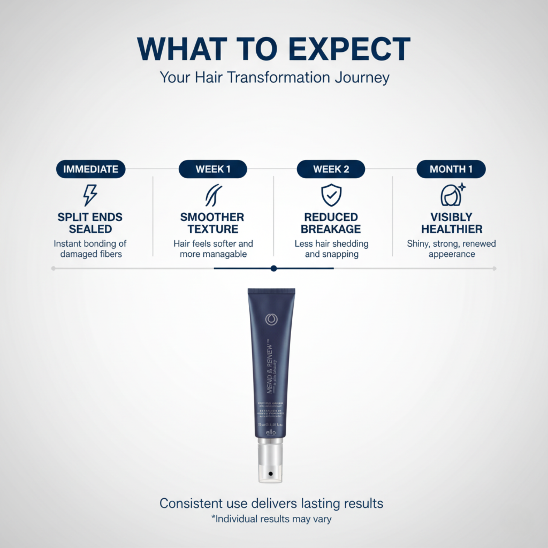 Our Split End Mending Serum works from the very first use—instantly sealing damage and restoring softness. With continued use over 2–4 weeks, it strengthens strands from root to tip, preventing new split ends before they start. The result: visibly healthier, smoother, and more resilient hair that looks freshly trimmed every day.