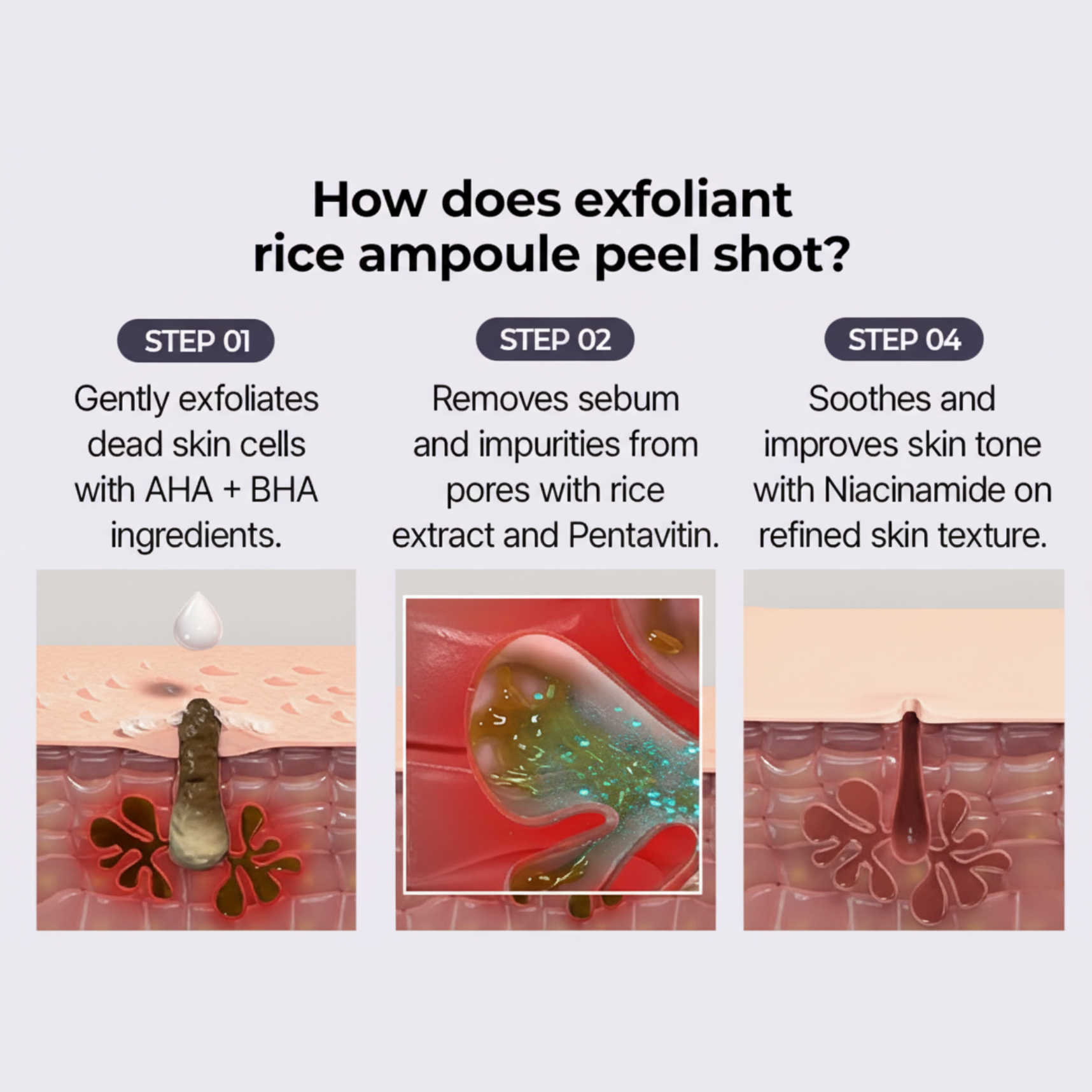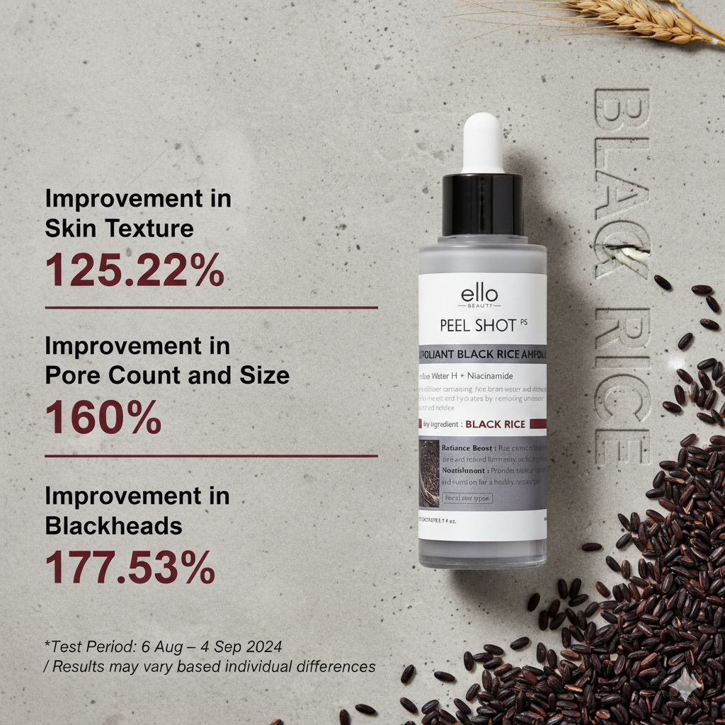 Watch blackheads dissolve. Feel texture smooth. See pores tighten. Peel Shot works in minutes, not weeks. The secret is our dual-action formula: black rice extract breaks down stubborn buildup while niacinamide prevents new congestion from forming. It's the reset your skin has been waiting for—and you'll see proof before you rinse.